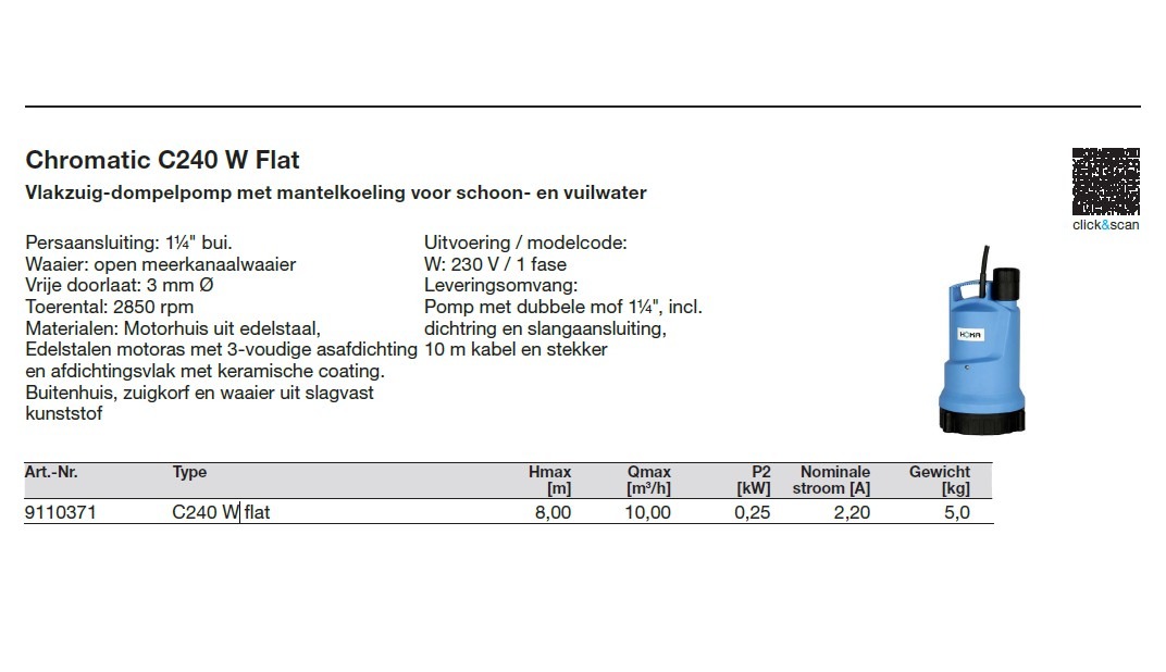Vlakzuig-dompelpomp met mantelkoeling voor schoon- en vuilwater