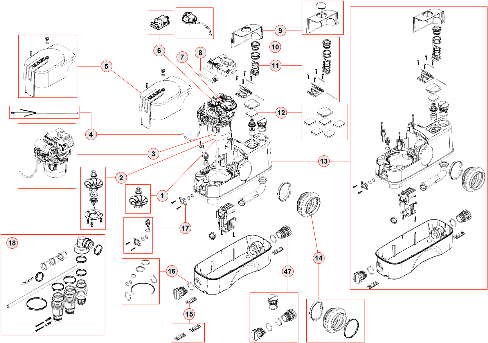 Polypropyleen tank met 15% barium. In de Comfort-versie: geluidsgedempte polypropyleen tank met 70% barium. Waaier van polyfenyleenoxide met 30% glasvezelversterking. Motoras van roestvrij staal. Vernikkelde roestvrijstalen snij-eenheid.