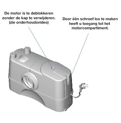 Bij een verstopping of motorstoring kan de motorunit eenvoudig met twee schroeven worden verwijderd en kan het water via de aftapkraan uit het pompstation worden afgevoerd.